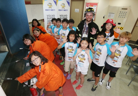 볼보건설기계가 13일 서울영어마을 수유캠프에서 임직원 자녀들을 대상으로 실시한 영어캠프에서 학생들이 소방관 체험교육을 받고 있다. / 볼보건설기계 제공