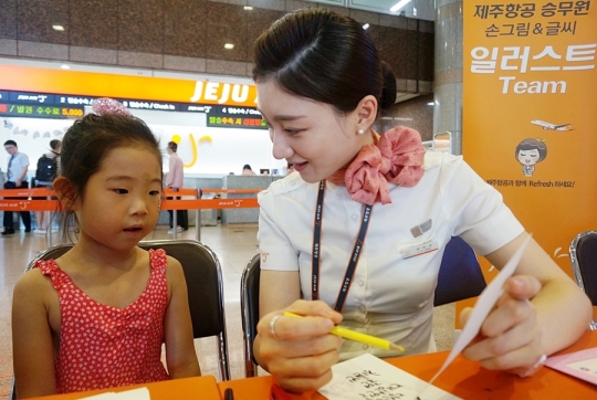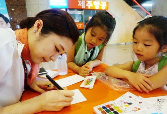 14일 제주항공 승무원들이 부산 김해국제공항에서 어린들에게 '대한민국의 멋진 어린이 OOO'등의 글귀를 직접 써서 선물하는 행사를 벌이고 있다. / 제주항공 제공