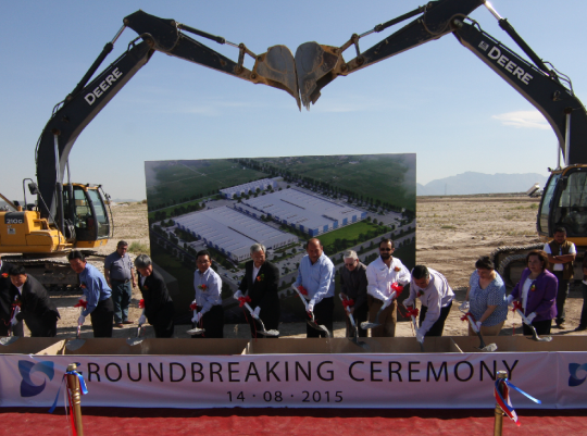 14일 멕시코 아르떼아가시의 만도 자동차 부품 공장 기공식에서 김주신 만도 아메리카 사장(좌측 네 번째부터), 성일모 만도 사장, 루벤 이그나시오 모레이라 코아우일라주 주지사, 세르히오 베르두즈코 로산 서버공단 창립자, 헤수스 두란 플로레스 아르떼아가시 시장이 기념 촬영을 하고 있다. / 만도 제공