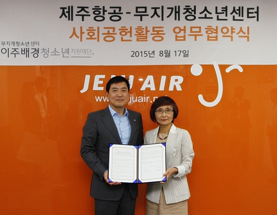 17일 제주항공 대회의실에서 최규남 제주항공 사장(왼쪽)과 강선혜 무지개청소년지원센터 소장이 이주배경청소년 진로지원을 위한 업무협약을 체결한 후 기념촬영을 하고 있다. / 제주항공 제공