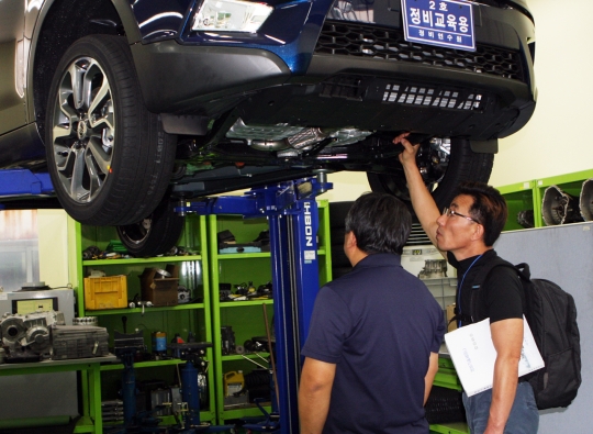 정비 실습 중 참가 교원이 신모델 티볼리를 살펴 보고 있다. / 쌍용차 제공