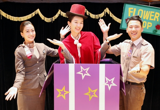 기내 특화 서비스팀인 '플라잉 매직'팀이 공연을 앞두고 포즈를 취하고 있다. / 아시아나 제공