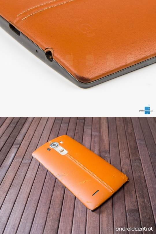 천연 가죽 후면 커버가 손상된 LG G4. /사진=폰아레나·안드로이드센트럴 캡쳐