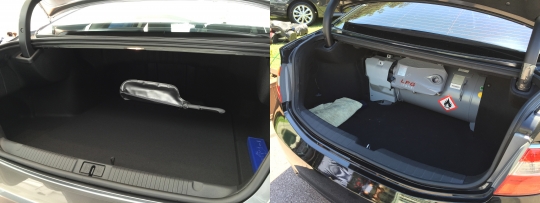 SM7 LPe(왼쪽)는 도넛탱크 방식으로 스페어 타이어 공간에 LPG 연료통을 탑재해 현대차 그랜저보다 적재 공간이 훨씬 넓다.