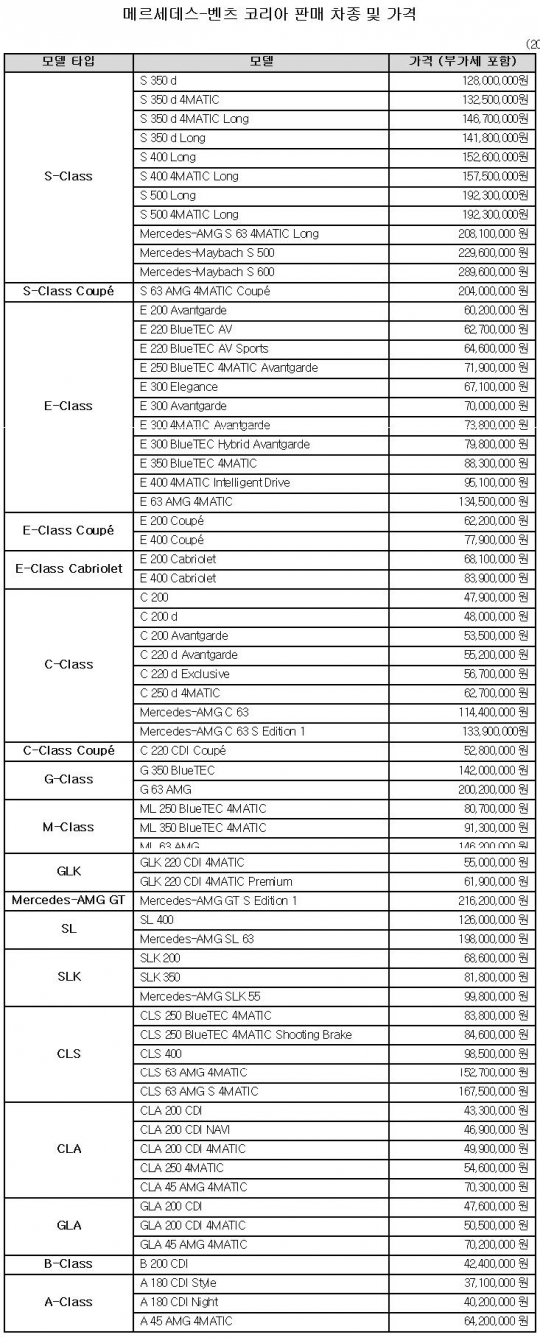 벤츠 자동차 개별소비세 인하분이 반영된 가격표 / 벤츠 제공