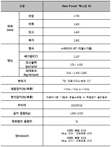 또한 렉스턴W에는 오토캠핑 등 레저 활동에 적합한 최대 견인하중 2000kg의 트레일링 히치를 옵션으로 선택할 수 있다. 레저 활동에 특화된 차량답게 내부·적재 공간도 넉넉했다. 이밖에도 전·후방 LED(발광다이오드)램프, 7인치 디스플레이, 10개의 인피니티 스피커, 스마트키 시스템 등의 편의사양을 갖췄다.
