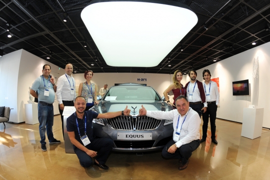 9일 각 국 딜러 사장단들이 강남오토스퀘어를 견학해 아슬란 차량 앞에서 기념촬영을 하고 있다. / 현대차 제공
