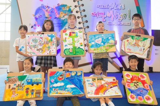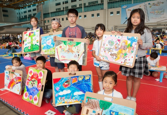 '제7회 내가 그린 예쁜 비행기' 사생 대회에 참가한 어린이들이 직접 그린 그림을 들고 기념촬영을 하고 있다. / 대한항공 제공