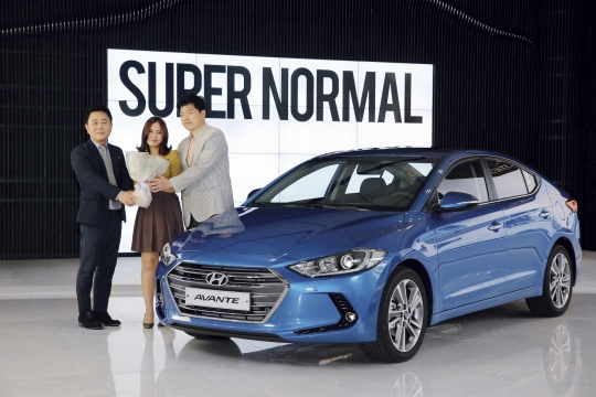신형 아반떼 1호차의 주인공인 이보희씨(왼쪽부터), 그의 아내, 곽진 현대차 부사장이 차량 전달식을 가지고 기념촬영하고 있다. / 현대차 제공