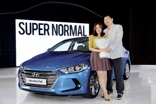 신형 아반떼 1호차의 주인공 이보희씨(오른쪽)와 그의 아내가 차량을 전달받고 기념 촬영하고 있다. / 현대차 제공