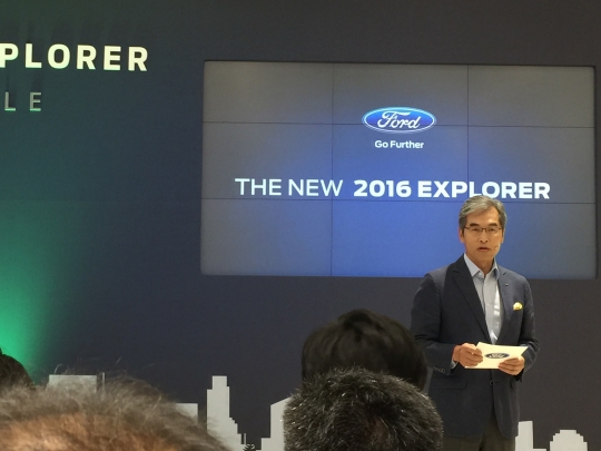 14일 정재희 포드코리아 사장이 '2016 뉴 익스플로러' 출시행사에서 프레젠테이션을 하고 있다.