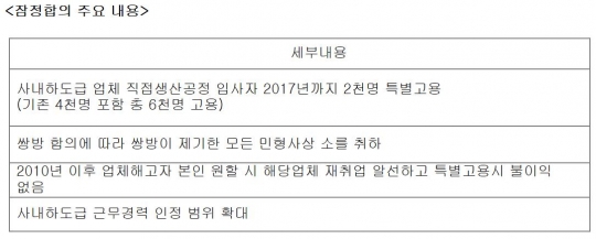 또 쌍방 합의에 따라 모든 민형사상 소송을 취하하고 업체 해고자의 경우 본인이 원할 때 해당업체에 재취업을 알선하고 향후 특별고용 시 불이익을 주지 않기로 했다.