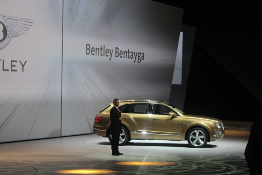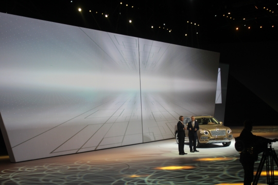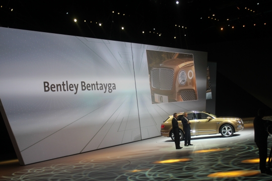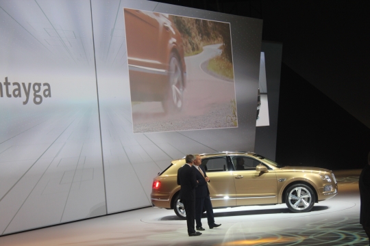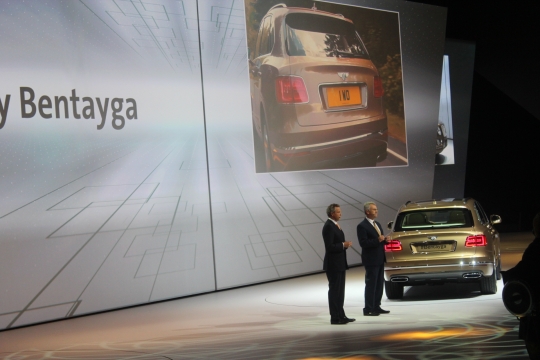 14일(현지시간) 독일 프랑크푸르트 프라포트아레나에서 열린 폭스바겐그룹 신차발표회에서 벤틀리 관계자가 SUV모델 벤테이가를 소개하고 있다.