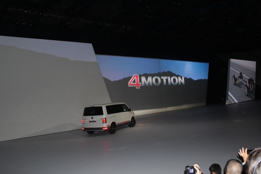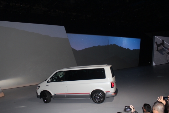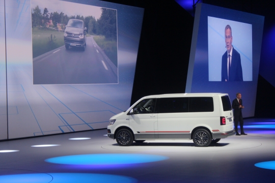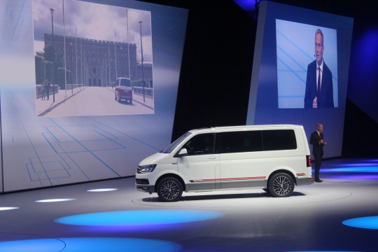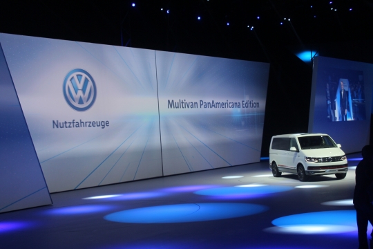 14일(현지시간) 독일 프랑크푸르트 프라포트아레나에서 열린 폭스바겐그룹 신차발표회에서 고위 관계자가 멀티밴 팬아메리카나 에디션을 소개하고 있다.