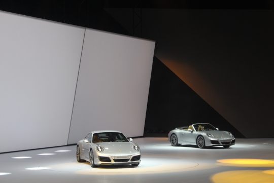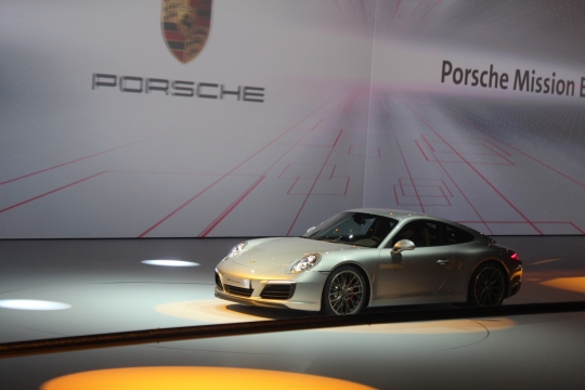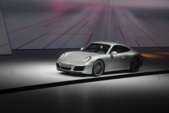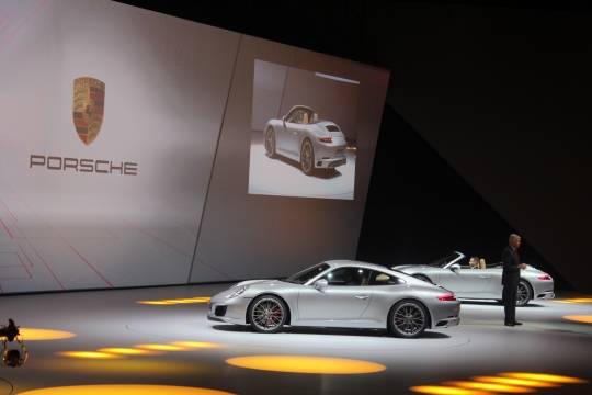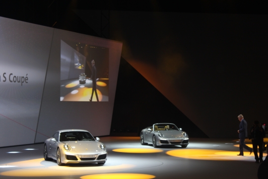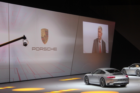 14일(현지시간) 독일 프랑크푸르트 프라포트아레나에서 열린 폭스바겐그룹 신차발표회에서 포르쉐 관계자가 포르쉐 911 카레라 S 쿠페 모델을 소개하고 있다.