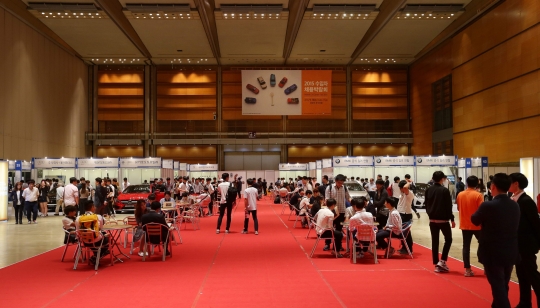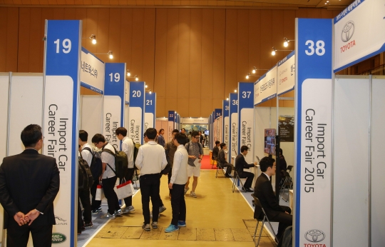 18일 서울 삼성동 코엑스에서 열린 '2015 수입차 채용박람회'에서 구직자들이 입사지원과 면접을 하고 있다. / KAIDA 제공