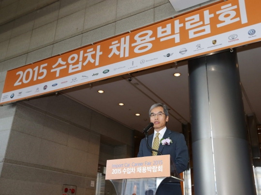 18일 정재희 KAIDA 회장이 서울 삼성동 코엑스에서 열린 '2015 수입차 채용박람회'에서 기념사를 하고 있다. / KAIDA 제공