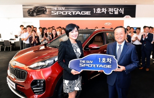 18일 신형 스포티지 1호차 주인공 민은정 상무(왼쪽), 김창식 기아차 부사장이 차량 전달식 후 기념 촬영을 하고 있다. / 기아차 제공