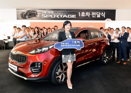 18일 신형 스포티지 1호차 주인공 민은정 상무가 차량 전달식 후 기념 촬영을 하고 있다. / 기아차 제공