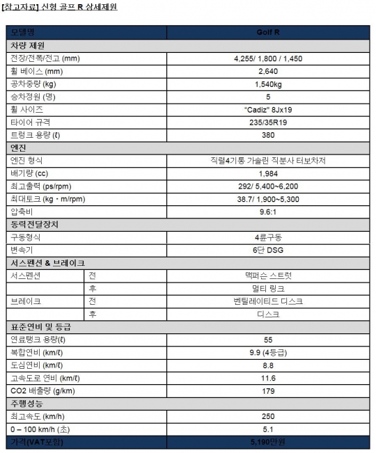 폭스바겐 골프R 제원표 / 폭스바겐 제공