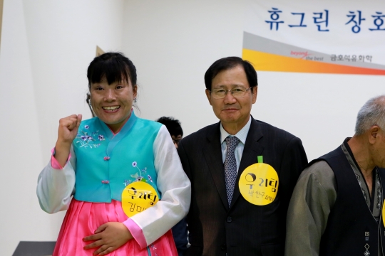 박찬구 금호석유화학 회장이 창호를 교체한 우성원 강당에서 윷놀이를 마치고 팀과 기념사진을 찍고 있다. / 금호석유화학 제공