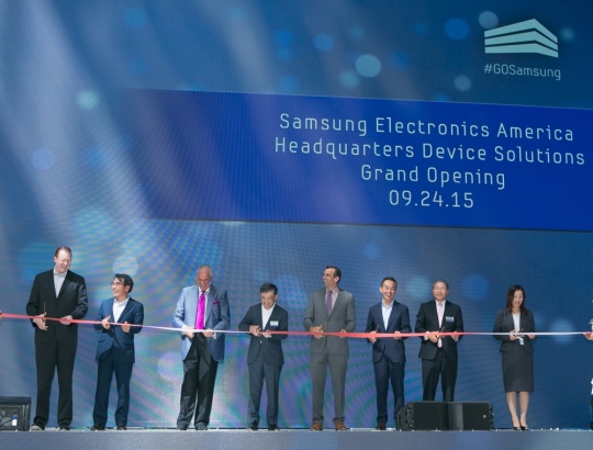 9월 24일(현지시간) 美 산호세에서 개최된 삼성전자 DS부문 미주총괄 신사옥 준공식에서 참석자들이 리본커팅을 하고 있다. 왼쪽부터 삼성전자 Bob Brennan SVP(Senior Vice President), 한재수 전무, 마이크 로시(Mike Rossi) 캘리포니아 주정부 Senior Advisor, 삼성전자 권오현 부회장, 샘 리카르도 (Sam Liccardo) 산호세 시장, 삼성전자 손영권 사장, 한동만 주샌프란시스코 총영사, 삼성전자 DS부문 미주지역 직원 대표 캐시 메이크피스(Kathy Makepeace)