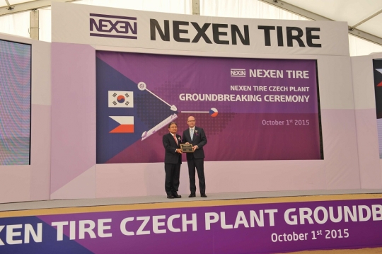 1일 체코 자테츠 공장 기공식에서 강병중 넥센타이어 회장(왼쪽)과 소보트카 체코 총리가 기념 촬영을 하고 있다. / 넥센타이어 제공