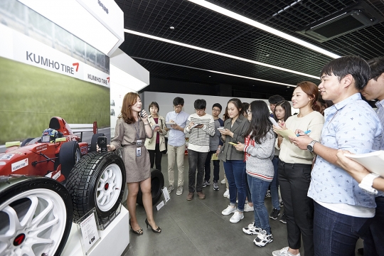 3일 경기도 용인 중앙연구소 쇼룸에서 이공계 대학생들이 타이어 관련 정보를 듣고 있다. / 금호타이어 제공