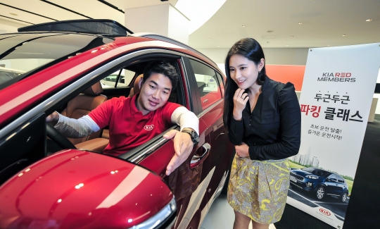 '드라이빙 클래스'에서 여성운전자가 전문강사로부터 주차 교육을 받고 있다. / 기아차 제공