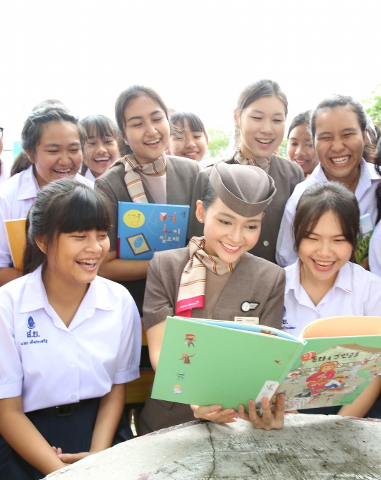 6일 싸라위타야학교를 방문한 아시아나항공 캐빈승무원이 학생들과 함께 한국어 도서를 읽고 있다. / 아시아나항공 제공