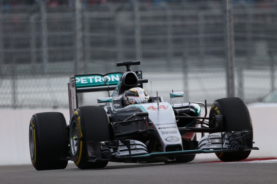 메르세데스 AMG 페트로나스 F1 팀 드라이버 루이스 해밀턴이 F1 러시아 결선에서 우승한 후 기념 촬영을 하고 있다. / 벤츠 제공