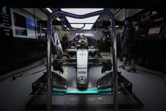 메르세데스 AMG 페트로나스 F1 팀의 엔지니어들이 차량을 정비하고 있다 . / 벤츠 제공