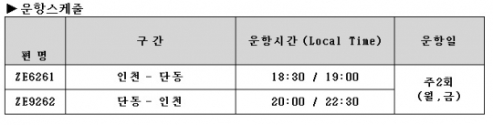 이스타항공 중국 단동 직항노선 운항스케줄.