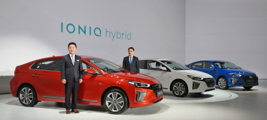 현대차 국내영업본부 곽진 부사장과 현대기아차 연구개발본부장 권문식 부회장(왼쪽부터)이 지난 14일 아이오닉 출시 행사 후 기념 촬영을 하고 있다.