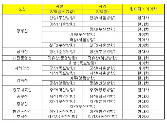 현대·기아차가 설 명절을 맞아 이달 5일부터 8일까지 4일간 전국 주요 고속도로 휴게소 총 31개 지점에 서비스코너를 마련하고 차량 무상점검 서비스를 제공하는 '설 특별 무상점검 서비스'를 실시한다.