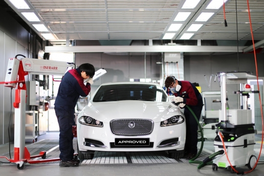 재규어 랜드로버 코리아 장안평 인증 중고차 전시장에서 차량 정비를 진행하고 있다.