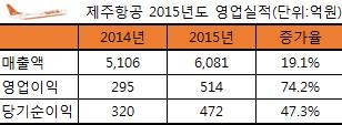 제주항공은 2015년 영업이익 514억원을 기록하며 전년대비 74.2% 증가했다고 16일 오후 공시했다. 제주항공은 이날 손익구조 변동 공시를 통해 매출액 6081억원과 영업이익 514억원, 당기순이익 472억원 등 2015년 영업실적을 공개했다. 매출액은 지난해 5106억원 보다 19.1% 늘었으며, 영업이익은 지난해 295억원보다 무려 74.2% 증가한 규모다. 당기순이익은 지난해 320억원보다 47.3% 증가했다.