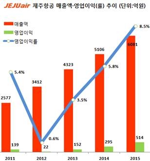 제주항공은 연간 매출액에서 2010년 1575억원, 2011년 2577억원, 2012년 3412억원, 2013년 4323억원, 2014년 5106억원에 이어 2015년 6081억원을 기록함으로써 6년 연속 '천억 단위' 앞자리를 바꾸는 기록행진을 이어가며 연평균 25%의 매출 성장률을 나타냈다.