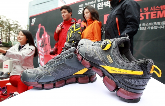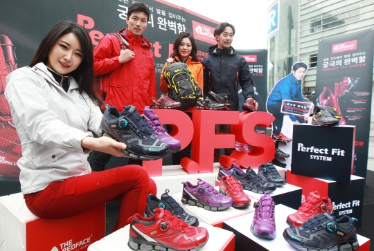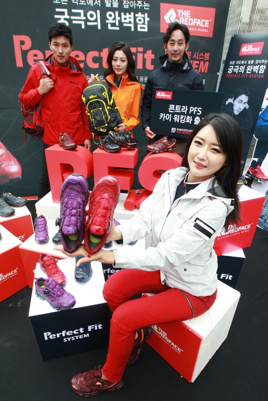 [메트로신문 손진영기자] 아웃도어 브랜드 레드페이스가 8일 오전 서울 청계광장에서 퍼펙트 핏 시스템이 적용된 '콘트라 PFS 카이 워킹화'를 선보이고 있다.