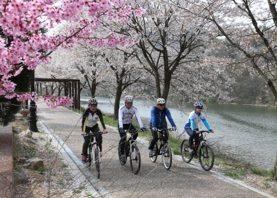 벚꽃이 만개한 충북 괴산의 오천자전거길에서 동호인들이 자전거를 타고 있다. /뉴시스