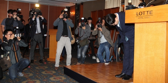 [메트로신문 손진영기자] 김종인 롯데마트 대표이사가 18일 오전 서울 중구 롯데호텔에서 열린 '와이즐렉 가습기 살균제' 피해자들에 대한 피해 보상 추진에 대한 기자회견에 참석해 사과하고 있다.