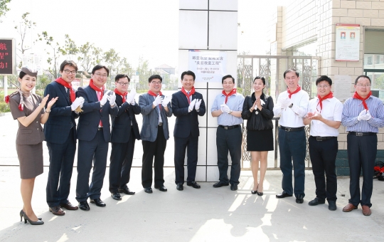 안병석 아시아나항공 중국지역본부장(왼쪽 여섯번째), 이선우 주상하이 총영사관 교육영사(왼쪽 다섯번째), 구원밍 서양현위 당부서기(왼쪽 일곱번째) 등 관계자들이 행사 후 기념촬영을 하고 있다.
