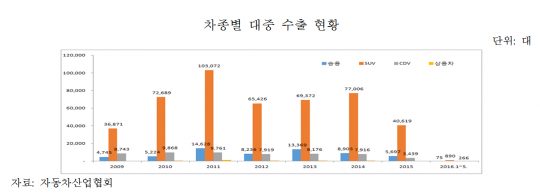 그러나 국내 자동차 업체들의 전반적인 판매 감소가 이어지면서 2015년 수출은 전년대비 47.6%나 감소한 9억4000만 달러에 그쳤다. 또 올해 들어 5월까지도 전년 동기 대비 93.7% 급락하면서 수출은 2679만 달러까지 떨어졌다.