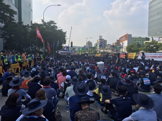 현대기아자동차그룹 노조 간부와 조합원이 금속노조 주관의 재벌개혁 총파업 투쟁대회에 동참한 것이다. 총파업 투쟁대회 참여 인원은 주최 측 추산으로 1만 5000여명에 달했다. 이날 현대기아차 본사 앞 4차선은 전국에서 모인 온 집회 참가자들로 가득 찼다.