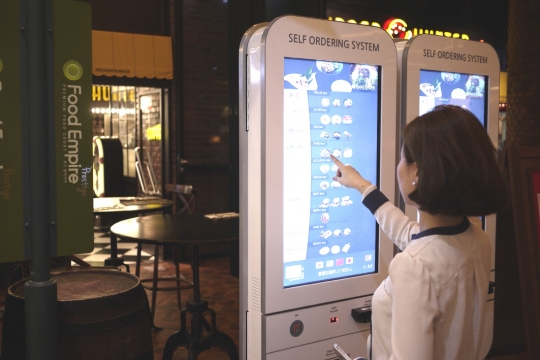 푸드엠파이어 IFC점에서 고객이 키오스크를 이용해 메뉴를 주문하고 있다./아워홈