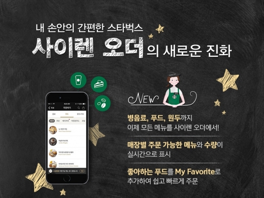 스타벅스가 사이렌 오더의 주문 메뉴를 푸드와 병음료, 원두까지 확대한다./스타벅스