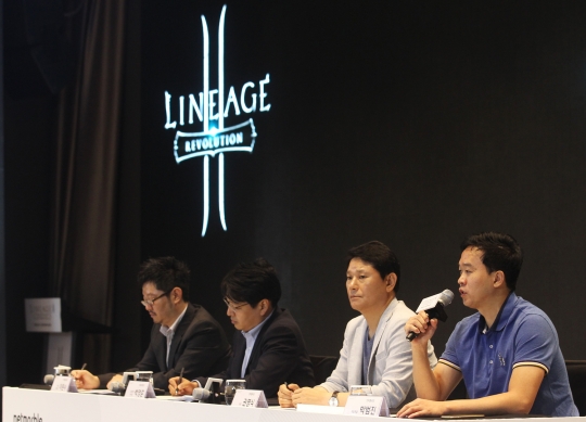 이완수(왼쪽부터) 넷마블게임즈 사업본부장, 백영훈 넷마블게임즈 사업전략 부사장, 권영식 넷마블네오 대표, 박범진 넷마블네오 개발총괄 / 손진영기자 son@