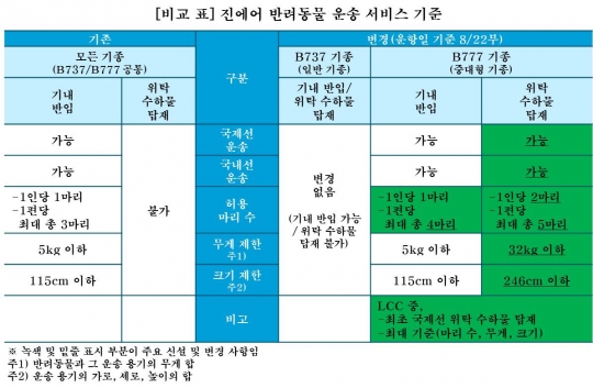 진에어가 국내 LCC 중 유일하게 운영 중인 중대형 항공기 B777-200ER 기종에 한해 차별화된 서비스를 신설 및 변경하는 것으로, 기존 대비 허용 마리 수와 무게 및 크기도 확대된다. B737-800 기종의 서비스 기준은 기존과 동일하게 유지된다.