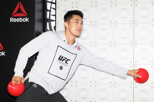 이종격투기 선수 김동현이 10일 오전 경기도 부천시 현대백화점 유플렉스관에서 진행된 '리복 김동현과 함께하는 특별한 팬이벤트'에 참석해 엑서 게임(Exer Game)을 즐기고 있다.