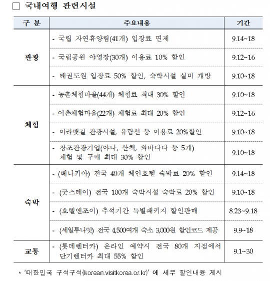 12일부터 16일 사이엔 전국에 있는 국립공원 야영장 30곳의 이용료도 10% 싸게 이용할 수 있다.